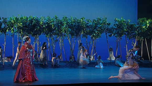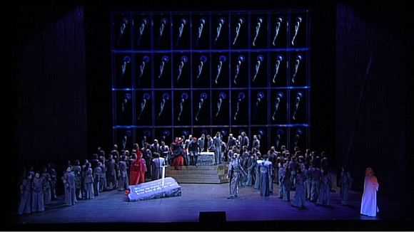 What makes this disk worth watching though is the realization of the work. The design, direction and choreography are excellent and all the performers give utterly committed performances. The sets (Heinz Balthes) and costumes (José Manuel Vázquez) are stylized Arthurian. The colour palette leans heavily to the blue end of the spectrum and the sets have lots of strong vertical lines. It’s effective and consistent with just the occasional use of a less blue red and green to point up the ‘otherness’ of Morgan le Fay, Mordred and Nivian. The designer is not afraid to make strong statements either. In Act 1 the back of the stage is a projection of a grid of babies. In Act 2 they are replaced by hanged men. It’s a strong commentary on the action. Dance is really important in this piece. There are a number of orchestral interludes that need to be choreographed plus two important characters; Guenevere and Lancelot, are represented by non-singing dancers. Paloma Diaz, as Guenevere, is on stage a lot and makes a major contribution to the action. Mei Hong Lin’s choreography is a key to the success of the production. John Dew’s direction ties it all together and makes for a pretty strong overall dramatic impact.