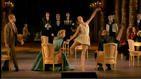 Capriccio is an opera about opera in general and about itself in particular. Carsen takes this idea and builds on it. He uses the idea of “theatre within a theatre” but in a way that is far removed from the boring “plonk a toy theatre down centre stage” that New York seems to think is avant-garde. Carsen uses the depth of the Palais Garnier stage, multiple proscenium arches, mirrors, stage boxes and, occasionally, crudely visible scenery to create a series of ambiguous spaces. It’s less “theatre within a theatre” than “Klein bottle within a Klein bottle”. The ambiguity comes to a head in the final scene where Olivier, Flamand and La Roche are in an orchestra box stage right with the Graf and Gräfin in a box stage left watching the Gräfin sing the great final scene in which she fails to decide between “words” and “music”. Is the Gräfin in the box a double or was that bit put in for the DVD? I don’t know. Then right at the end Carsen pulls an extraordinary coup de theatre which it would be spoilerish to reveal. I totally understand the hooting and hollering from the audience. It’s stunning.