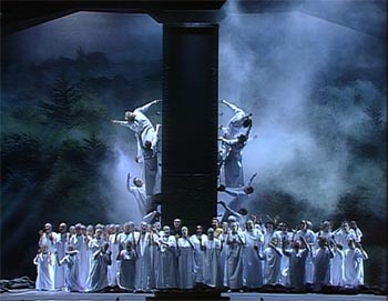 Video direction is by Brian Large and, despite that, I had some hope after the first scene where we actually get to see the set occasionally. My hopes were soon dashed by a series of relentless and often inappropriate close ups. When there’s a dance number involving three quite good and very good looking dancers focussing on the elderly gent who is slavering over them is just perverse. In the immolation scene the camera work reaches unprecedented levels of ponceyness with dissolves, superpositions, weird angles and strange close ups. It’s truly horrible.