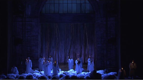 The stage productions too are very different. Stein Winge in Barcelona eschews the opulence of 1620s Russia and opts for a bleak 1950s setting. This actually works quite well in bringing out the self serving agendas of the three main characters as well as their essential smallness when deprived of their bullying platform. There are some neat touches. Khovansky senior has a dwarf. The respect and affection with which he treats the dwarf compared to his son highlights the impotence and irrelevance of the latter. Chillingly it’s the dwarf who delivers the fatal blow in act 4 after a scene with his dancers that makes Khovansky seem more like Silvio Berlusconi than a powerful warlord. It’s even oddly unerotic. The Persian dancers are straight out of a Disney version of the Arabian Nights which is a rather stark contrast with Kirchner’s lesbian BDSM near porn scene. The final mass suicide in Barcelona is played out in a low key but effective way with the stage lit only by candles that are extinguished one by one. The pathos is heightened by the inclusion of children among the Believers.