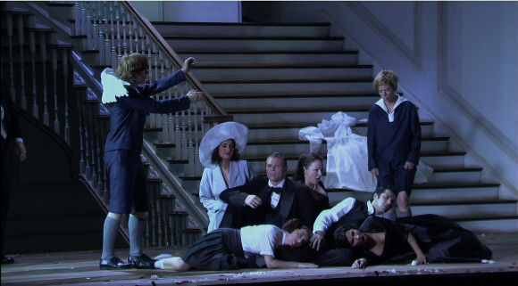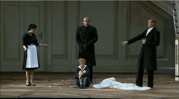 These ideas are played out on a simple set of an entrance hall with a wide staircase and multiple doors This allows characters to come and go at various levels and offers multiple “hiding places”. Except they aren’t. Very little is hidden. Most of the things that some or other character is supposed not to have seen are played out more or less in their full view. It’s as if everyone is complicit in all the plots all the time. Only briefly, at the beginning of Act 4, do we get away from this openness as, temporarily, the plot thickens and a screen with three large doors descends in front of the staircase. In the ensembles, the relationship complexities are brought out in the careful choreography of Ramses Sigl. In the septet at the end of Act 2 they are even graphed in video projection above the singers. There are also a myriad of small touches that it would be tedious to list and I’m not sure I understand them all anyway.