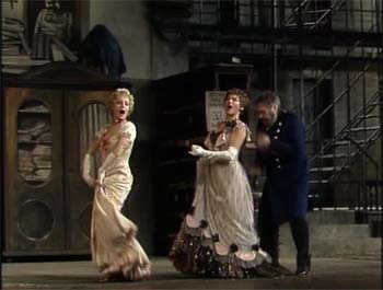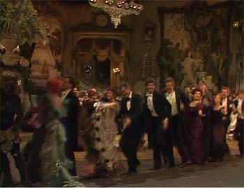 The main problem with the disk is the video direction. It’s the work of Brian Large whose quirks seem to be exacerbated by the Schenk approach. Schenk puts lots of “stuff” on stage; tons of furniture, chorus, dancers and supers all over the place and then Large focusses in on a head shot or an upper body shot which, inevitably, has all sorts of distracting background whirling in and out of shot. He also does something I’ve never seen before; he films the conductor while there is singing going on on stage. I know appearances by Kleiber were pretty rare but that’s just ridiculous.