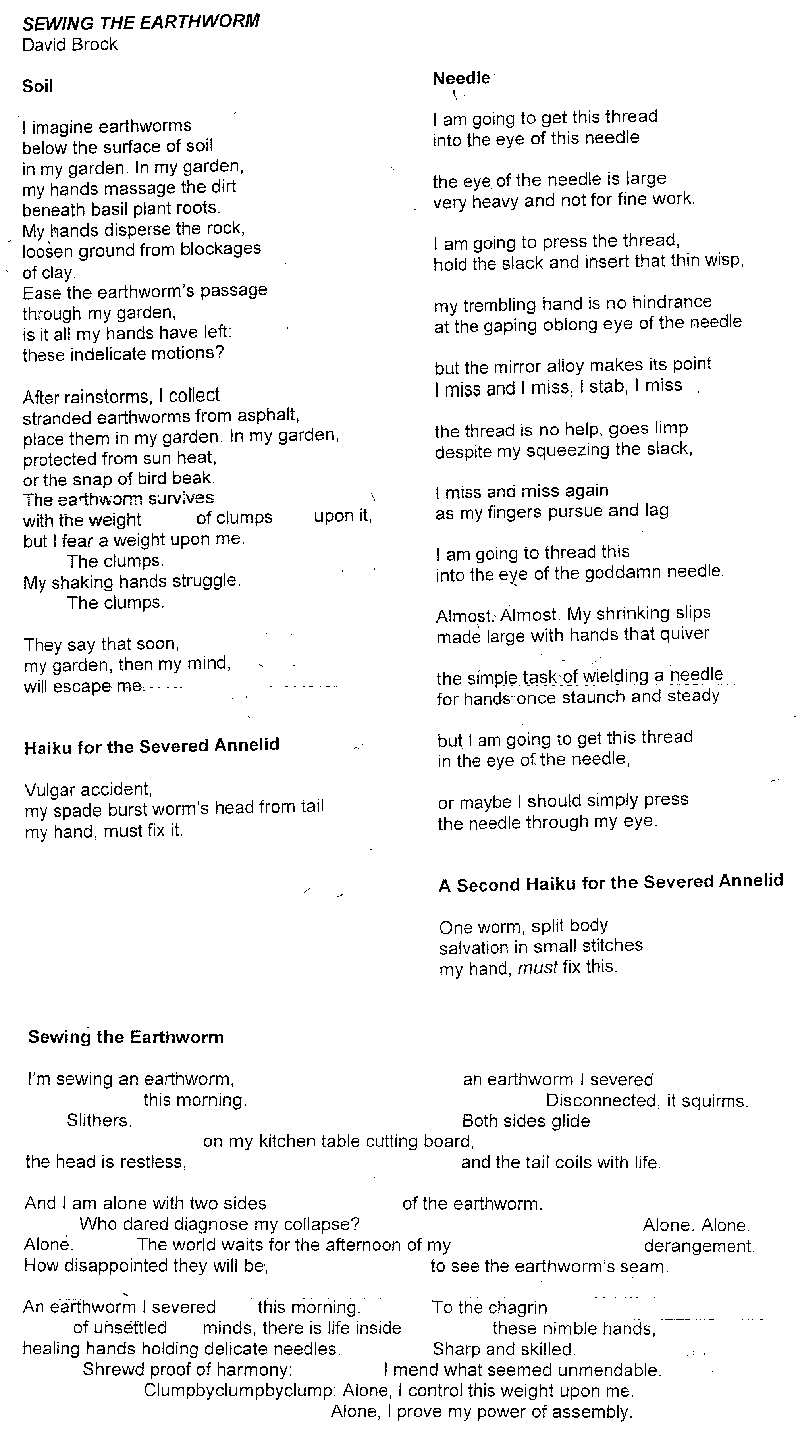 Finally we had the world premiere piece; Sewing the Earthworm. The text (see below) is by David Brock and the music by Brian Harman. It’s a piece about physical decay and the mental anguish that goes along with it. The music is uncompromisingly modern requiring a range of vocal and piano technique. Much of the piano part lies either very high on the keyboard or is played inside the piano. The vocal part combines tricky intervals with sprechstimme, humming and a bunch of other stuff. It’s probably a work one needs to listen to more than once to really grasp. No complaints about the performances though. Soprano, Carla Huhtanen was riveting and she was very well backed up by Steven Philcox at the piano.