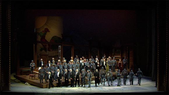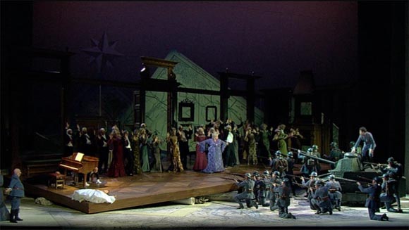 Laurent Pelly’s 2007 production of Donizetti’s La Fille du Régiment was a coproduction of the Royal Opera House, The Metropolitan Opera and the Wiener Staatsoper which one make expect to produce a stodgy snoozefest. It’s not. It’s a fast paced, energetic and funny production. There’s nothing especially cleverly conceptual about it but its well designed, well directed and well played. If one were to be hyper critical it would be that the humour in Act 2 is rather laid on with a trowel but it’s not too seriously overdone. The setting is updated from the wars of the first Napoleon to something vaguely WW1 like. In some ways this doesn’t make a whole lot of sense but it does provide a visual “Frenchness” that’s probably easier for modern audiences and, anyway, the libretto as originally written is about as historically accurate as the average piece of bel canto fluff. Best not get into serious military history buff territory and get on and enjoy the show.