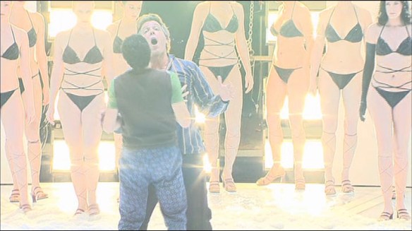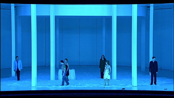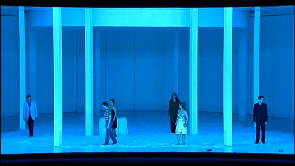 The singing and acting is generally very good.  The casting provides a pleasing variety of tone colour in which the whole is more than the sum pf the parts.  Among the men Thomas Hampson’s lyrical baritone Don contrasts nicely with the darker, almost coarse, tone of Ildebrando d’Arcangelo’s Leporello.  Both of them act superbly too.  They are well supported by a much less annoying/boring than usual Don Ottavio in Piotr Beczala and an almost ludicrously young looking Luca Pisaroni as Masetto.  Robert Lloyd is a straightforward Commendatore but he’s pretty much an optional extra in this production.  The three sopranos are even more of a contrast.  At one end there’s the light lyric voice of Christine Schäfer as Donna Anna and at the other the bigger, brighter and more dramatic voice of Melanie Diener as Donna Elvira.  In between is Isabel Bayrakdarian as Zerlina, already starting to show the much darker tones in the middle and lower registers that have become so apparent in the last couple of years.  All of the singing is good and the acting responds well to the demands of some pretty detailed and demanding Personenregie.  I was less convinced by the conductor (Daniel Harding) and the orchestra (Wiener Philharmoniker).  At times the orchestra seems to be lagging the action but it’s hard to tell because the voices are balanced a long way forward and the orchestral sound is more muffled than it ought to be on a modern recording (at least that’s how the DTS 5.1 track sounds, maybe the PCM stereo is better but I doubt it).  All in all the singers rather seemed to be left to get on with it.