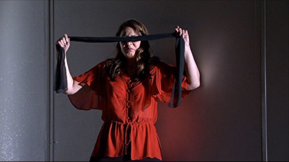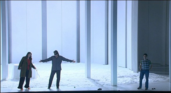 The supper scene is weird and curiously abstract. It is snowing in Don Giovanni’s palazzo. There isn’t any actual food and wine. The serving, eating and drinking are all pantomimed. This is the context for the final encounter with Donna Elvira. He mocks her of course but then he produces the scarf and blindfolds himself. At the conclusion of the trio he rips off the scarf and approaches Donna Elvira with it but she’s not having any. She screams and runs off. Don Giovanni can mock the kind of relationship he had with Donna Elvira and Donna Anna and tried to have with Zerlina but the jokes on him because time has run out. Enter the Commendatore and the sisters of Persephone. Within minutes Don Giovanni is dead and his sexual identity is moot.