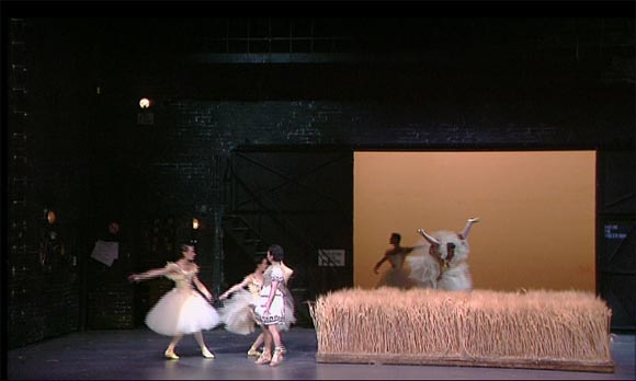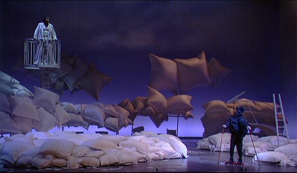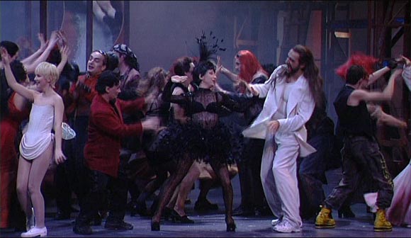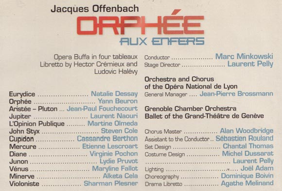 After the hours of discussion about what Lee Blakeney really meant in his COC Les Contes d’Hoffmann a little light relief seemed called for. Fortuitously I had just got my hands on the 1997 Opéra National de Lyon recording of Offenbach’s Orphée aux Enfers so I thought that might do the trick. I was dead right. The production by Laurent Pelly is an absolute hoot (or, to quote young British mezzo, Emilie Renard “FILTHY!”). The high speed, somewhat surreal production is brilliantly executed by a predominantly French cast including Natalie Dessay as Eurydice and Laurent Naouri as Jupiter. There’s so much going on that it would be tedious to provide a full description. Highlights include Ms. Dessay’s typical party trick of singing fiendish coloratura while performing demanding physical moves, her trademark “loudest scream on an opera stage”, Pluton (Jean-Paul Fourchecourt) dancing in snow shoes, an Olympus that most closely resembles the Smut Puddle at a Burner party, some unusual unisex choreography brilliantly danced by the dancers of the Ballet-Théatre de Genève and, not least, Laurent Naouri, dressed as a fly, orally stimulating Ms. Dessay to a very loud climax. The screen caps at the end of this post will give you a better idea. It’s fast, it’s funny, it’s vulgar and it’s terrific fun. The whole thing is carried along by appropriately lively and idiomatic musical direction from Marc Minkowski with the Orchestra and Chorus of the Opéra National de Lyon and the Grenoble Chamber Orchestra. Full cast listing below: