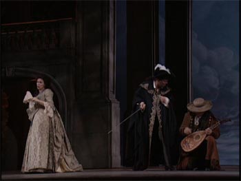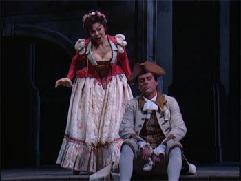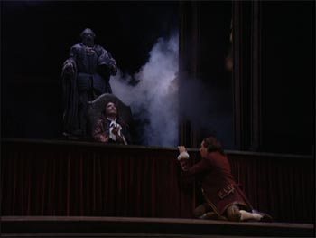 The 2000 Metropolitan Opera recording of Mozart’s Don Giovanni is based on Zeffirelli’s 1990 production somewhat modified by director Stephen Lawless. It’s an entirely traditional “breeches and boobs” affair with baroque painted flats, tricorne hats etc. Blocking is mostly very basic with a lot of “park and bark” just livened up with a bit of prop twiddling. It works because it has a superb cast who sing and act (within the limits of the production) extremely well.