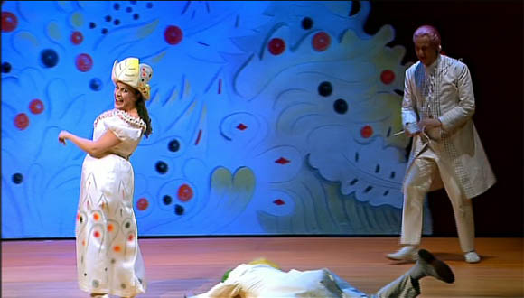 To match the artificiality of the plot director Cesare Lievi and designer Tullio Pericoli create a sort of exaggerated “children’s colouring book” environment. The staginess is reinforced by some stylised poses and characters entering and exiting on a moving track. It’s interesting to look at and works well backed up by careful Personenregie and some really good acting.