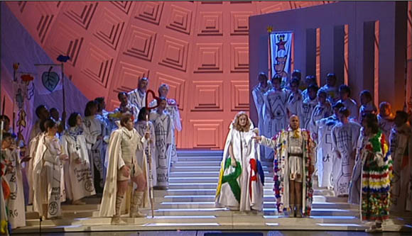 I can’t fault Harnoncourt’s conducting or the support he gets from the Zurich Opera House Orchestra and Chorus. He is really into the piece and gets very stylish and lively playing from his band. The DVD sleeve claims that the orchestra is “configured to replicate that which would have been available to Offenbach” but there’s no explanation of what that means as the DVD package is the usual Kultur label minimalist effort. There did appear to be some odd looking instruments in the brass section but otherwise nothing was obvious to me.