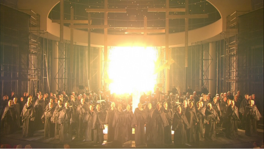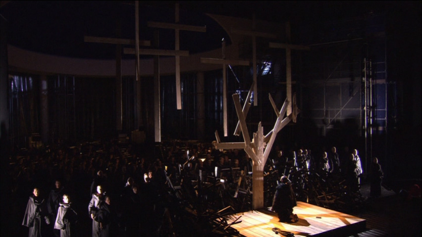 The staging is striking. It appears that the stage of Het Muziektheater has been built out over the pit to bring the action closer to the audience. Various semi-abstract pieces of scenery representing a pile of crosses, a monastery gate, a wood etc are place on platforms on the apron. The conductor and orchestra are behind the apron in full sight. Behind them galleries and gantries curl around the rear of the stage providing settings for the chorus and the Angel. Above everything is a sort of planetarium dome representing the heavens.