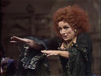 Jean-Pierre Ponelle’s production features a stepped and colonnaded podium behind which the backdrop changes uses drops that look sort of like engravings.  From time to time a stylized “head of Neptune” is worked into the design.  The singers are dressed in a sort of mash up of 18th century and Classical Greece.  It’s all pretty much monochrome and subdued except for Elettra’s bright red “I’m batshit insane” wig.  It’s also quite dark a lot of the time.  Blocking is pretty basic tending to symmetrical arrangements of characters parking and barking.  The acting varies from a succession of stock baroqueish gestures to really quite good.