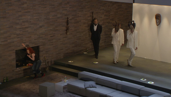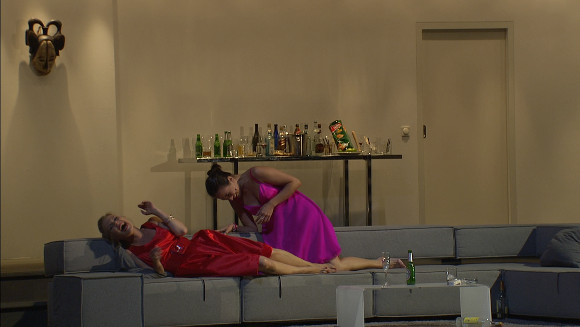 This production was staged in the Haus für Mozart and uses a single set. It’s the girls’ apartment; a very expensive looking two level loft with a broad staircase that recalls the Figaro. The setting is contemporary and it opens on the aftermath of what appears to have been a rather good party. The men are preparing to leave when Don Alfonso issues his challenge. It’s the edgiest version of the scene I’ve watched with quite an undertone of violence. This is clearly not going to be a light comedy. By Una bella serenata the characteristic feathers of the Figaro have appeared. The edginess continues throughout the first act with many deft touches, especially a power cut staging of Come Scoglio. When the “Albanians” appear there is only the most perfunctory effort at disguise. No slapstick moustaches here.