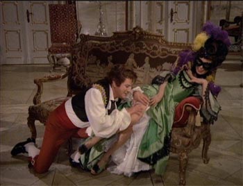 Václav Kašlík’s 1973 lip synched film version is very 1970s. All sorts of sub Ken Russell like effects are employed and the sound track is seriously overproduced. It’s also cut by maybe 30 minutes, at least compared to the Mörbisch stage version. The singing is pretty good and the acting is adequate for 1970s opera. The standouts, in several senses, are Julia Migenes as the maid Ciboletta, and Sylvia Geszty, as the foster sister Annina. Decent performances too from Anton de Ridder as the duke, Trudeliese Schmidt as Barbara, Cesare Curzi as the cook Pappacoda and Jon Piso as the barber Caramello. There are some decent dancers and the Chor des Bayerischen Rundfunks and the Münchner Rundfunkorchester under Kurt Eichorn at least sound suitably Viennese.