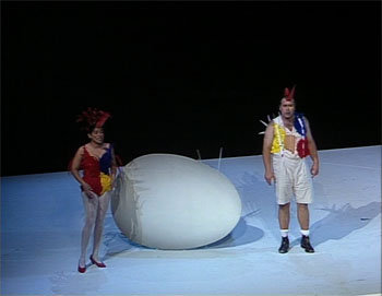 Unfortunately it goes down hill a bit from there. Cornelius Hauptmann’s Sarastro is dull and underpowered and totally uncharismatic. Andrea Frei’s Queen of the Night is rather painful. Her vibrato opens out in her upper register and her pitch seems quite uncertain. Tamino appears to be beaten down by her coloratura in Act 1 and well he might be! She’s a bit better, but not much, in Act 2. The Papagena, Patricia Rozario, acts well and looks good but when she actually has to sing comes off rather shrill. The minor parts are fine and the orchestra and chorus are quite acceptable. Wolfgang Gönnenwein conducts efficiently but doesn’t seem to have anything very original to say. If the singing consistently equalled the staging this would be pretty good but it doesn’t.