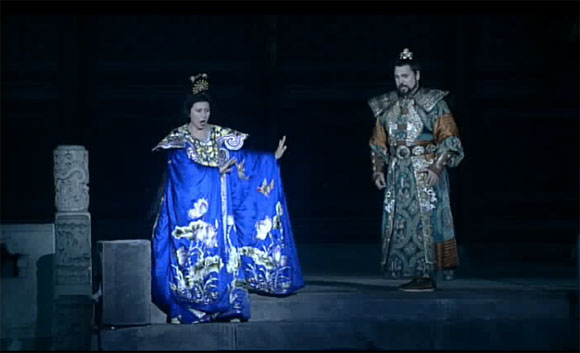 In this recording Zubin Mehta and the musicians of the Maggio Musicale Fiorentino have teamed up with noted film director Zhang Yimou (Raise the Red Lantern etc.). He’s a fine director but noted more for spectacle than subtlety. Throw in the Forbidden City and a cast of thousands and it’s pretty clear what one is going to get. This production has huge set pieces, bright colours, martial arts, incredibly ornate costumes and, of course, Puccini’s big, loud score. I imagine that seeing it live must have been quite thrilling if a little indigestible. Unfortunately it’s just the sort of thing that doesn’t translate especially well to DVD even when viewed on a largish screen. Video directors Hugo and Ruth Käch try hard to balance depth of shot and to show what’s important but there’s just too much going on and a standard definition picture can’t hold the needed detail. At times they almost give up and resort to cutting in shots of the Great Wall or architectural details. It’s all a bit of mish-mash and, not being absorbed into it as a live audience might be, it all seems rather superficial.