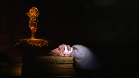 Act 1 is set in a circular room with a sort of golden boy figure at centre.  It’s atmospherically lit, perhaps aiming for a sort of gas light effect.  It’s quite striking but it can’t have made it easy to film.  Renée Fleming, as Violetta, makes quite an impression.  There’s something almost unbalanced about her acting (in a good way) that completely belies the Fleming who can only stand there and look goofily pretty.  She also makes a pretty good fist of the coloratura passages which are, for her, probably the least comfortable parts of the role.  We also get our first look at Joseph Calleja as Alfredo .  He seems just right for the role with decent acting and just the right weight of voice.