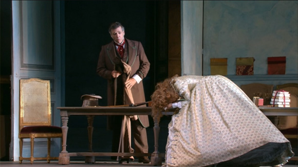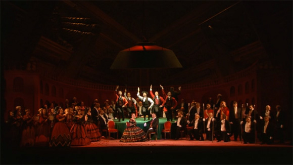 Richard Eyre’s production of La Traviata at the Royal Opera House, filmed in 2009, is a pretty good example of how to do a traditional production.  There’s nothing conceptual or thought provoking to it but the direction is careful and tells the story clearly and well.  The designs are mid 19th century with crinolines and tail coats but with the odd imaginative touch and a welcome refusal to succumb to the “more stuff” syndrome that plagues so many Verdi and Puccini productions.  Backed up by excellent music making it probably makes a near ideal introduction to the piece, even if it won’t entirely displace Willy Decker’s brilliant and disturbing Salzburg production in my affections.