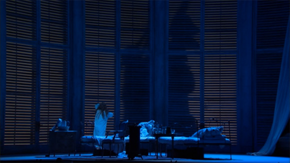 For Act 3 we have the canonical garret but there’s an unusual amount of blood around.  No squeamishness from Eyre here.  I’ve seen Lucias with less blood on them.  Fleming manages to switch gears again very well and really conveys the fragility of the dying Violetta.  The sense of doom is highlighted by the carnival being represented by giant shadows on Violetta’s windows.  The final trio is very affecting and Fleming pulls the death scene off very well.  Tony Pappano conducts a really searching and sympathetic account of the score and he’s well backed up by the orchestra, chorus and all the cast.  It’s really hard to find fault with anything much.