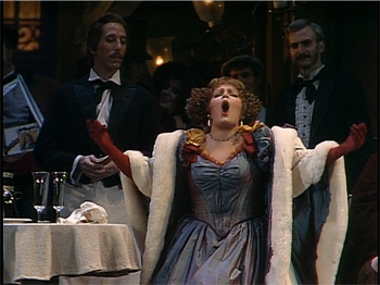 The production and direction is by Francesca Zambello and it is as straightforward and conventional in design as it could possibly be. The Christmas scene looks like something out of a very old BBC production of A Christmas Carol. If there was any direction of the actors beyond basic blocking it’s not evident. As it happens Freni acts very well as does Gino Quilico as Marcello. Sandra Pacetti, on the other hand, gives us a very crudely cartoonish Musetta who simply isn’t sexy. To be fair she’s much better in the final scene than in her appearance at Momus’. There is some really good singing as might be expected. Quilico is pretty much in the same league as the big stars though once again Pacetti is a bit disappointing with some swooping and general insecurity. The conducting, by Tiziano Severini, seems a bit anonymous but part of this may be because the sound is balanced to place the orchestra very much in the background.