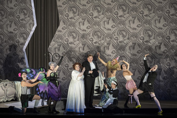 So what about the performances? They were uniformly excellent. The prettiest singing perhaps came from David Pomeroy as Alfred. He also got the silliest costumes of the night on a night of extraordinary costumes. Tamara Wilson was a fine Rosalinde. She was much the biggest voice on show and made the most of it where needed. Michael Schade showed what a brilliant comic actor he is. His every movement seemed carefully calculated to the task and the overall result was wonderful. He’s a pretty decent singer too! Laura Tucker’s Orlofsky was, mercifully, quite restrained. She sang her big, difficult aria well and wasn’t annoying. Peter Barrett’s Falke was a tour de force. One never lost sight of who was pulling the strings and his presence when he wouldn’t normally be on stage was well managed. German actor Jan Pohl was the most sinister Frosch you will ever see. To say more would be spoilerish. James Westman, as Frank, sang and acted well and wears an evening gown quite elegantly. Then there was the Adele of Ambur Braid. This was the role she’s been waiting for. The part sits nicely for her voice and she displayed comedic talents quite equal to Michael Schade. She’s also, of course, very sexy. Judging by the applause at curtain call time, she was the crowd’s favourite. It’s becoming redundant to say this but Sandra Horst’s fine chorus were once again very fine indeed.