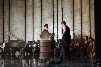 I noted in an earlier post how meticulously conductor Johannes Debus had been working with the orchestra during rehearsals. Last night we heard the result. This is a singular interpretation of the score and one that fits entirely with the production concept. Don’t expect the mellifluous tones of the Vienna Phil on auto-pilot. What Debus has produced is a sound that is more Vienna in the period Alden has set the piece. Obviously it’s not twelve tone but there’s an aggressive, driving rhythmic quality that brings out a new and slightly disturbing quality in the music. Like the production it’s bold and effective.
