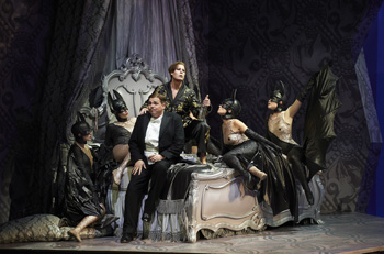 All of the above might make the reader think that this is an overly serious affair. It isn’t. All the zany, frothy comedy one could wish for in a Fledermaus is there helped by quite spectacular costumes (Constance Hoffmann) and careful attention to timing and detail. Allen Moyer’s simple but elegant set, which eliminates delays for scene changes, and a rather ruthless trimming of the spoken dialogue keep everything moving along and careful direction of a comedically talented cast make for a funny, sexy, fast paced romp which provoked more laughter than I’ve heard before at a live opera.