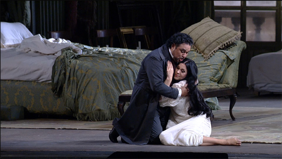 The music making is very fine. It centres around Gheorghiu inevitably. She gives a full blooded old fashioned diva style performance. Her singing is fabulous and if the acting is maybe a bit broad for video close up I think it must have been spectacular in the house. The full range of emotion is there and her technique is immaculate. She is very well supported by Ramón Vargas as Alfredo and Roberto Frontali as Germont. Vargas, of course, is a terrific singer in this repertoire and on this showing (and his performance in the COC Il Trovatore) his reputation as a bit of a plank in the acting department is rather unfair. Here he looks and sounds the part. I thought Frontali started out slowly. I took a while to warm up to his voice, which isn’t as silky as say Tom Hampson or Gerald Finley, but he has a good sense of style and he sang his big Act 2 aria with excellent control of colour and some real display of emotion. The supporting roles are all perfectly adequate. Lorin Maazel conducts and it’s a very dramatic, well paced reading of the score. The orchestra and chorus respond to his direction extremely well. It’s terrific music making all round.