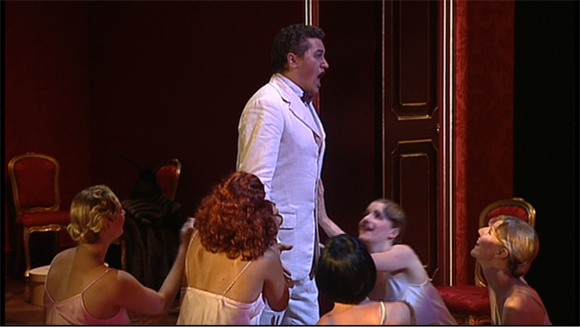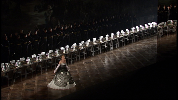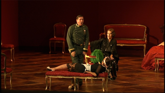 So back to the production. There are lots of things to like. The heavy make out action between the Marschallin of Adrienne Pieczonka and Angelika Kirschlager’s Octavian in Act 1 is nicely handled. The splendid Franz Hawlata plays Ochs, here an army officer with a military entourage, as less buffoonish than usual which makes his utterly clueless behaviour in Act 2 all the funnier. There’s a cameo appearance by Piotr Beczala as the Singer (serious luxury casting that!). The Marschallin’s bedroom is very red and prefigures the equally red brothel in Act 3 in a typical act of Carsen symmetry and lighting design. There seems to be a lot going on at the ends of the stage all through this act but we see very little of it on the DVD which is a shame as it seems quite interesting. Kirschlager’s translation into the maid, Mariandel, is all the funnier as she seems to be wearing a novelty shop slutty French Maid outfit. To be fair this is nothing on her outfit and performance in the brothel scene though. I think most of us are probably more familiar with Zeitgeist of the run up to WW1 (and if you aren’t, go read Ecksteins) than with that of the court of Maria Theresa so it feels more real and less like a fairy tale than some productions of Rosenkavalier.