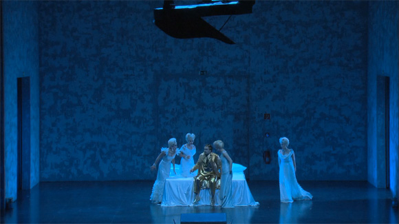 Kirsten Harms production is fairly straightforward though with some neat touches. The “shower of gold” is actually the score of the piece falling from an upside down piano that remains above the stage for the entire performance. Even in her final poverty it’s the one thing that Danae holds onto. There’s also humour as the palace is stripped by his creditors. All the artwork seems to represent Jupiter seducing one or other of his nephews’ wives. When we first see them they are accessorised so we can tell who is who. For example, Leda has a swan purse. Harms and her team assume we know our myths. There’s also a very funny scene involving a rather athletic Jupiter, a bed and his four squeezes. All in all, the relationships between the characters are well brought out and there is excellent chemistry between Jupiter and his lovers and Midas and Danae. The changes of mood are very much helped by a brilliant lighting plot by Manfred Voss.