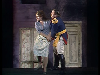 2.marie_tmAdolf Dresen’s production is pretty much entirely literal.  It follows the instructions in the libretto to the letter.  There’s nothing especially interesting about it visually but there is nothing awful either.  The general acting style, as epitomised by Franz Grundheber in the title role, could be interpreted as either appropriate expressionism or over-acting.  For me, it more or less works in the context of this particular piece.  The one person who transcends this is Hildegard Behrens as Marie who really makes this most difficult role come to life.  Walter Raffeiner’s swaggering Tabourmajor is of a piece with the rest of the production but the minor characters don’t really make much impression.