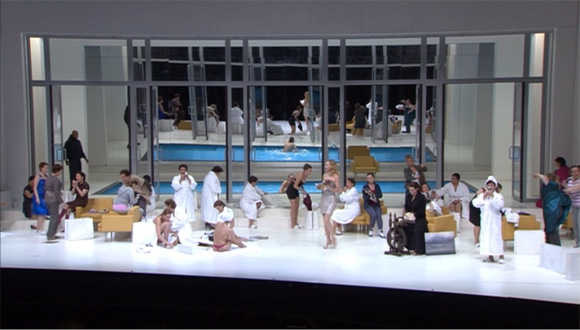 Martin Kušej’s production of Der fliegender Holländer for De Nederlandse Opera recorded in 2010 is high concept and it’s worth looking at the interviews with the cast and conductor before watching the main event. Certainly the essay in the booklet will do little to prepare you. For Kušej, Daland’s ship is a cruise ship or pleasure yacht full of expensively dressed partygoers. The Dutchman’s “crew” are refugees or desperate economic migrants. The Dutchman himself has made his pile in human trafficking. The framework of the “outsiders” wanting a share of the “insiders'” goodies is the backdrop for the interpersonal drama of Senta, the Dutchman and Erik.