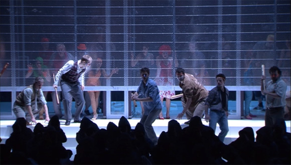 Does it work? Yes and no. The concept holds up pretty well in the chorus heavy scenes but it never really seems to connect with the central drama. Sure, it provides a way of identifying dowdy Senta and proletarian Erik as in some sense different from the glitz gang, headed by platinum blonde queen bee Mary, but it doesn’t provide any real rationale for Senta’s fascination with the Dutchman legend or why she takes to the actual Dutchman as presented. A Dutchman shorn of the mythical elements is a bit hard to navigate. At worst though it makes for interesting visuals.
