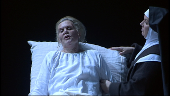There are some very good performances from the principals too. Dagmar Schellenberger succeeds in projecting the “always on the edge of cracking up” nature of Blanche de la Force. Anja Silja uses her decades of experience to create a really effective and moving Madame de Croissy. This surely is one of the greatest roles for an older female singer. Barbara Dever is rock solid as Mère Marie de l’Incarnation and Laura Aikin is excellent in the smaller part of Souer Constance and truly moving in the fatal finale. This scene is handled super effectively by Carsen and it makes a splendid ending to a very strong production. Among the men the standout is Mario Bolognesi as L’aumonier.
