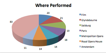 Place of performance continues to show a weird bias to Glyndebourne with 21 entries. Close behind are Salzburg and Paris with 19 and 18 and the Met and the ROH with 14 each. In total the recordings were mad in something like 45 different houses in Europe, North America and China. Curiously a full 10% of the performances are films rather than recordings of stage productions.