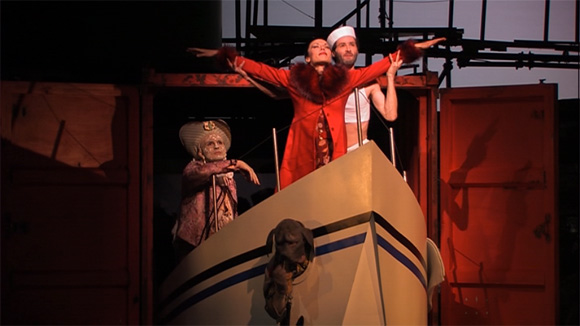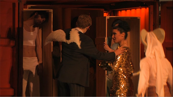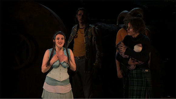 The performers are all, I think, drawn from the Vlaamse’s Opera’s ensemble and I think there’s only one I have seen before; the extremely photogenic Katarina Bradić seen previously as Leda in the Berlin Die Liebe der Danae. She looks stunning as Medea and is a great actress. She sometimes sounds a bit strident in her upper register but is generally a more than competent singer. It’s easy to see why she is a go to Carmen for half the second tier houses in Europe. Giasone is sung by Christophe Dumaux who is a sort of countertenor equivalent of a barihunk. He’s also a very fine singer and actor. Isifile is sung by the slightly less stunning Robin Johannsen. Actually she’s probably the best singer of the lot and sounds really beautiful in her big numbers. Talking of big numbers, her breasts; sufficiently large to suckle twin baby heroes, get a lot of air time in this production. Rounding out the principals is Andrew Ashwin as Ercole/Oreste. Besides the kilt he’s given giant ears so if you can imagine a Belgian Spock in a kilt you’ll have the picture straight. He’s also very competent. The rest of the cast of gods, Argonauts and servants; mostly playing multiple roles is thoroughly competent. Filippo Adami as the stuttering comic character Demo (there’s always one it seems) is especially good. Federico Maria Sardelli conducts the Symphony of the Vlaamse Opera, here cut down to twenty instruments, and doubles up on sopranino recorder.