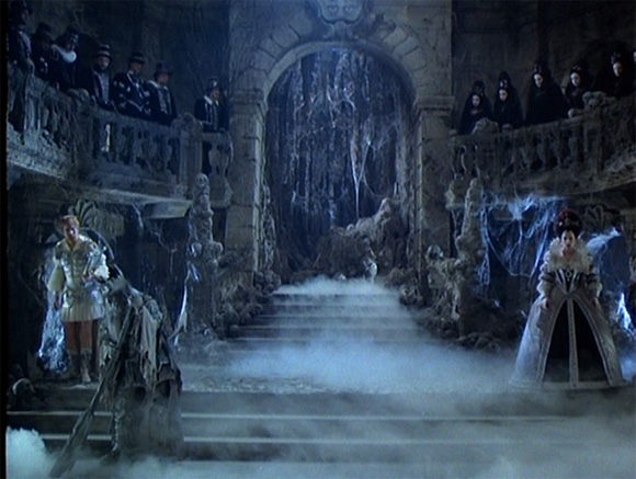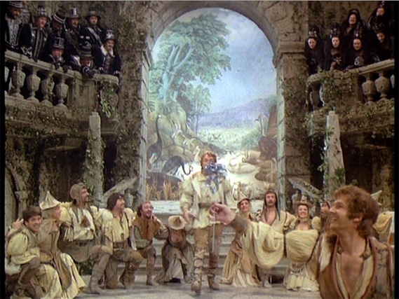 The L’Orfeo is very typical of Ponnelle films. Costumes combine elements of the 17th century with elements of antiquity. There are strong verticals. Although shot in a studio the piece is still set in a theatre, or something rather like one. There’s a kind of naivity to the camera work and a heavy use of the nose-cam. Anyone who has seen other examples of Ponnelle opera films will recognise it instantly.