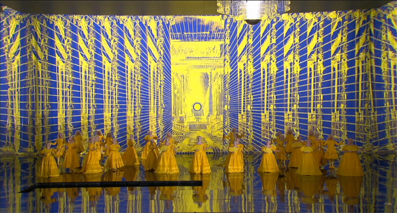 David Alden’s production for De Nederlandse Opera, recorded in 2009, isn’t typical Alden at all. It’s spectacular and whimsical and even funny in places but there don’t seem to be any big ideas let alone perverse or perverted ones. The only really Aldenesque moment comes at the end of the prologue where France rips the dress off Spain and beds her in a manner that’s rather less than consensual. That said, there’s lots to like along the way and even Alden haters will probably enjoy this production. There are lots of spectacular effects and costumes. Neptune appears in Act 4 in a sea of radio-controlled fish for example and the “mummified” spirits of the wronged are quite spectacularly horrid. Ercole himself gets an amazing muscle suit, six inch platforms and monster wig which taken together rather evoke the Schwarzennegging Song and drinks from six packs of Heineken mini-kegs. It takes “barihunk” to a whole new level. There are also a lot of interpolated ballets to music by Llly (as originally staged). Fortunately the choreography is quite varied and they aren’t too much of a snooze though they do make the work rather long.