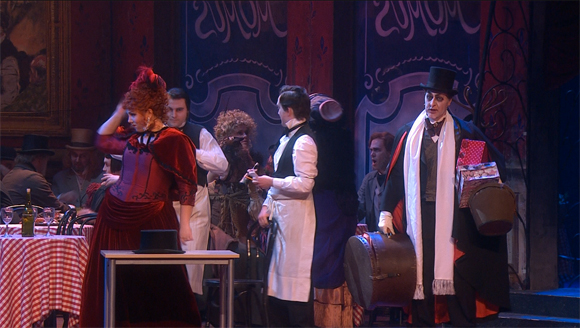 The performances are generally pretty good though the singing isn’t absolutely top drawer. Marita Söllberg gives a very committed and convincing performance as Mimi. At times her tone is a little thin but maybe that’s forgivable in a ghost. Jennifer Rowley is a wonderful Musetta. She has the voice for the part and whether she’s the sexy nurse or the good time girl she convinces. Svein Erik Sagbråten is brilliant in the many roles of Death. Solid singing and excellent acting combine here to make much more than the sum of the parts. Vasilij Ladjuk is a solid Marcello. The weak link is perhaps Diego Torre’s Rodolfo. He’s got the notes but doesn’t sound especially idiomatic and his acting is rather one dimensional with a limited range of stock gestures. Eivind Gullberg Jensen conducts efficiently; no small order given how much is going on on stage. The orchestral and choral forces of the Royal Norwegian Opera are fine, especially the children who show some really acting talent in the changing moods of Act 2.