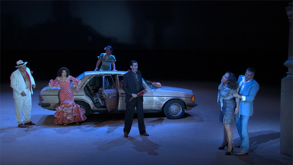 Calixto Bieito has a reputation as one of opera’s “bad boys” but there is nothing particularly shocking about his production of Carmen filmed at Barcelona’s Liceu in 2011. The action is updated to maybe the 1970s (there’s a phone box and a camera that uses film) and there are lots of cars on stage. For Bieito, this is a story of people living on the margins where sex is a commodity that women use as a trade currency and where violence, especially toward women, is endemic. It’s enough to disturb, as this piece did its original audience, without being gratuitous.
