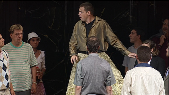 The other thing that I found puzzling in Kušej was the running around in the background and, especially, the scenes with the boys in underpants. Apart from being illustrative of Kušej’s fixation with underwear (see Don Giovanni) I don’t really get, still, what’s going on here. The final scene, with the “boys for dinner” motif remains especially perplexing. Still, it’s probably less confusing than the canonical scene in Ursel and Karl-Ernst Herrmann’s 2005 Paris production which not only includes a rather bizarre muscle suit but also the artefact that has become the generic term for a bizarre Regie artefact; Berenice’s potato.[ETA: Is it because Berenice has become a political “hot potato” or is that too obvious?]