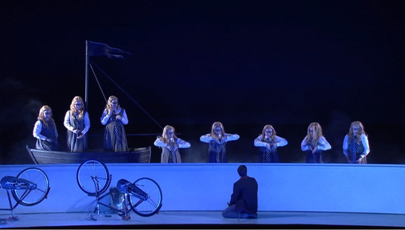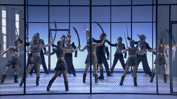 The basic idea here is that the story is the escapist fantasy of a bullied schoolboy. It draws heavily on the British school story genre with obvious references to St. Trinian’s along the way. (How much Carsen’s Upper Canada College experiences influenced matters is anyone’s guess). The scene opens with Rinaldo being bullied for having a picture of Almirena pinned inside his desk. Armida and Argante enter as gown and cap clad staff who find Rinaldo’s pack of cigs and beat him. Armida is fond of using her cane. (Rarely can so many bottoms have been smacked on the stage of a major opersa house!) Then Rinaldo’s fantasy starts as the crusader knights enter via the blackboard and slaughter his tormentors.