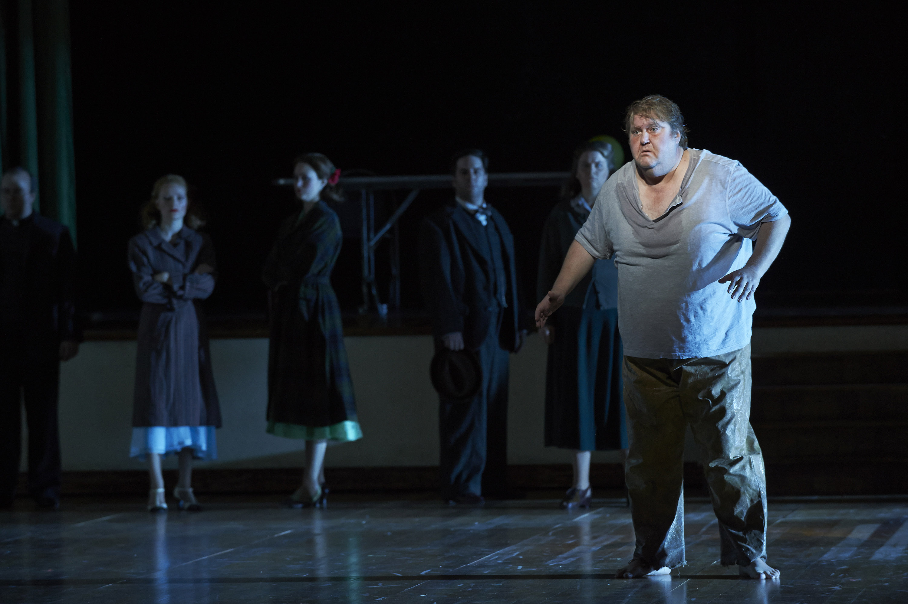 He sets the piece around the time of its composition which works well enough. Even in the 1970s that part of Suffolk had changed little from the era in which Crabbe’s poem is set. It’s set in a sparse space that might be a village hall with a stage area at the back. There are a few tables and chairs, frequently rearranged, and, at times, a few nets and ropes make an appearance. For the scene in Grimes’ hut. The stage area moves from back to front of stage to reveal a very conventional representation of Grimes’ hut. The Konzept, if there really is one, is to introduce Dr. Crabbe as a, silent, character. Armfield notes that the libretto does reference Crabbe in a couple of places and expands on this to show the creator of the story as if he’s directing and judging a performance in the village hall. It verges on cliché theatre within a theatre but mercifully never quite descends there. Dr. Crabbe aside, the direction is excellent. Each character is clearly delineated and plays a distinct role in the life of the Borough. Movement, especially of the chorus and some supernumerary boys, is well thought out, often strikingly menacing and beautifully sensitive to the movement. The relationships of the central trio and the boy are believable and intense. It’s fine theatre.