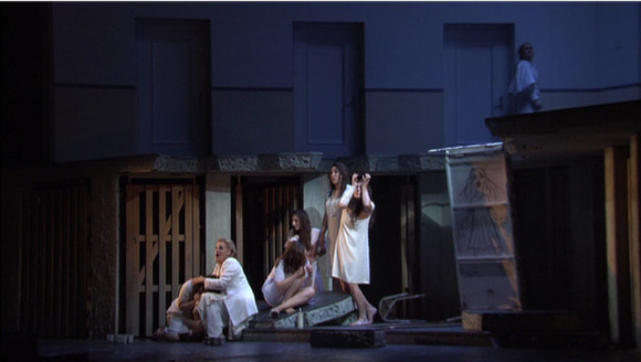 In Claus Guth’s production recorded in Barcelona in 2011 he out-Maeterlinck’s Maeterlinck. What few visual stimuli Maeterlinck provides are here mostly expunged. The fabulous treasures of the first six doors are here barely hinted at. Bluebeard’s riches are replaced by a soft toy, a shawl and some cheap costume jewellery. The magic castle is replaced by a suburban villa and the wives, Ariane included, wear simple shifts in light, neutral colours. He uses a unit set with a skylight, six doors, a short staircase to the forbidden seventh floor and a hole in the floor to represent the cellar where the wives are imprisoned. All this too is done up in neutral, light colours. In Act 2 the outside world is barely hinted at by vague video projections but that’s it. What we do get is frenziedly neurotic movement by the five imprisoned wives. The overall effect is to place even more distance between audience and work which becomes an extended meditation by Ariane. But on what?