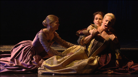 Deborah Warner’s entry point to Purcell’s Dido and Aeneas is the, almost certainly apocryphal, story about it premiering in a girls’ boarding school. At various points in the action we get a chorus of schoolgirls in modernish uniforms commenting silently on the action. They are on stage during the overture, are seen in dance class during some of the dance music and queue up for the Sailor’s autograph. It’s quite touching and adds to the pathos of the basic, simple, tragic story. Warner also adds a prologue (the original is lost). In Warner’s version Fiona Shaw declaims, and acts out, poems by Ovid/Ted Hughes, TS Eliot and WB Yeats. These additions aside the piece is presented fairly straightforwardly in a sort of “stage 18th century” aesthetic. The witch scenes are quite well handled with Hilary Summers as a quite statuesque sorceress backed up by fairly diminutive (and, for witches, quite cute) Céline Ricci and Ana Quintans. Their first appearance is quite restrained but they go to town quite effectively in their second appearance.