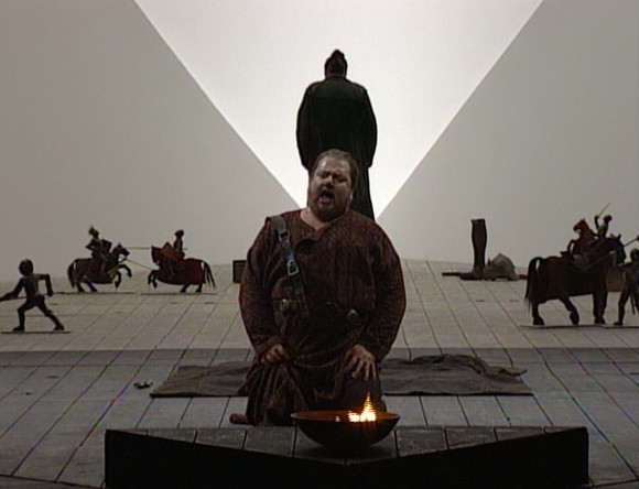 The production is mostly made up of geometric shapes and movement is kept to a minimum. Often, as in the Act 2 duet, figures are reduced to silhouettes by the lighting. It’s quite beautiful in a stark way but the lack of visual action really does demand that the singers inject some life into the piece. Katarina Dalayman as Brangäne and René Pape as König Marke show how it can be done with nuanced and affecting performances. Unfortunately Brangäne and Marke can’t carry the piece for four hours and it desperately needs the same level of dramatic performance from the two principals. It doesn’t get it. Ben Heppner, as Tristan, isn’t too bad but he can act much better than he does here. Maybe he is dragged down by the utterly lifeless display by Jane Eaglen as Isolde? It doesn’t help that they are both rather large and dressed in costumes that look like they were put together from a sort of medieval Goodwill store. In any event, the overall effect is a Tristan with little chemistry between the lovers which fatally undermines any attempt to create the passion this piece ought to have.