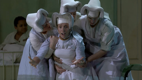 Suor Angelica is pure Catholic kitsch. Jones setting it in the ward of a children’s hospital with lots of winsome little boys does nothing to downplay this. It’s also a good candidate for Dodgy Theology Night at the Opera. To sum it up briefly. Angelica is an aristocrat who has been placed in a convent by her relatives for disgracing the family by having an illegitimate son. She has become the herbalist. Seven years later her guardian aunt arrives to sort out some kind of inheritance deal. Angelica learns her child is dead and decides to “join him in Heaven”. Having popped the pills she realises (all of a sudden) that this is a mortal sin and that she is damned. She prays for redemption and all kind of soupy musical clues that she is saved appear. Musically it’s a vehicle for typically Pucciniesque female hysterics plus lots of angelic off stage nunnery. It’s schlock but this all female cast gives it a good shot with especially fine performances from Ermonela Jaho as Angelica and Anna Larsson as a thoroughly unpleasant Princess.