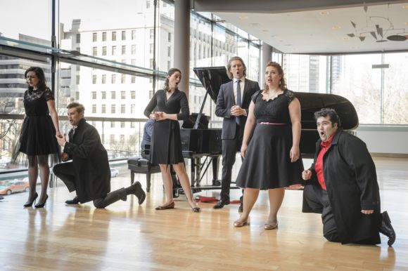 Today’s lunchtime concert in the Richard Bradshaw Amphitheatre featured members of the COC Studio Ensemble performing extracts from Act 1 of Così fan tutte as a teaser for their performance of Atom Egoyan’s production on February 7th. This promises to beeven more confusing than usual as the young lover roles are all being shared to accommodate everyone. Today, Clraence Frazer and Danielle MacMillan being sick we had but one Guglielmo, Cameron McPhail, and one Dorabella, Charlotte Burrage. Andrew Haji and Owen McAusland alternated as Ferrando and Sasha Djihanian and Aviva Fortunata doubled Fiordiligi (those two, at least, are easy to tell apart). Gordon Bintner sang Don Alphonso and Claire de Sévigné played Despina.