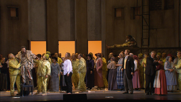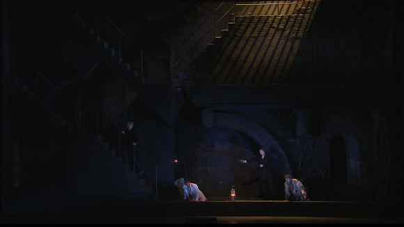 Katharina Thalbach sets her Fidelio, filmed at Zürich in 2008, somewhere in the early 20th century. Most of the costuming suggests very early but Don Pizzaro’s suit suggests 20s/30s gangster. Maybe he’s just fashion forward. The story telling is fairly straightforward and there’s no big concept. There are a few, smallish, touches. For example, the prisoners seem to be playing basketball with Don Pizarro’s head in the conclusion. The sets are literal but evocatively lit and rather effective.