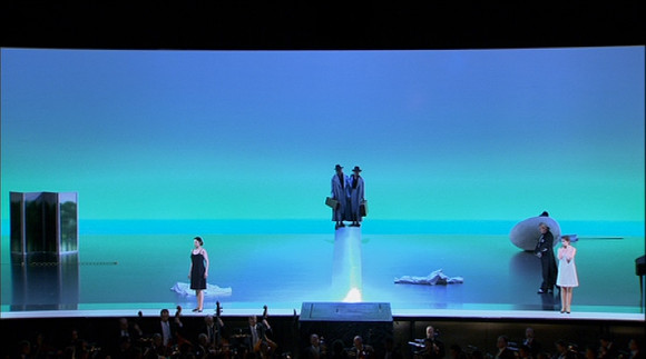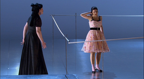 The designs for this production are very spare. The huge stage of the Grosses Festspielhaus is almost empty. Occasionally a few bits and pieces of props or scenery appear but otherwise the stage is bare but for an egg (see above) and a fortepiano (complete with Rachel Andrist most of the time). The egg is clearly the Berenice’s potato of this production. I have no idea what it means. Tom Allen has suggested it contains Karl-Ernst Herrmann’s brain but who knows. The empty space creates lots of opportunity to suggest emotional alienation but it also makes filming very difficult. This is one of those DVDs where one feels that there is more happening than the camera is letting us see.